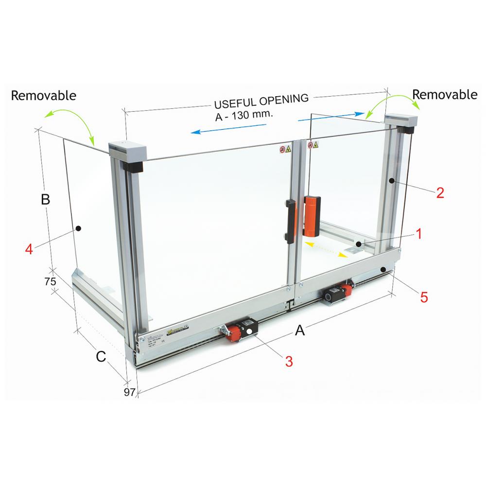 • Montiran je na obodu mize stroja in je opremljen z dvema drsnima vratoma na krogličnih vodilih, ki so izdelana iz debelostenskega plastičnega materiala.